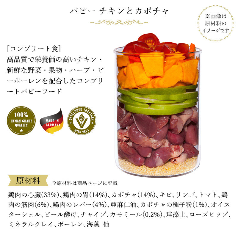高品質で栄養価の高いチキン・新鮮な野菜・果物・ハーブ・ビーポーレンを配合したコンプリートパピーフードです。