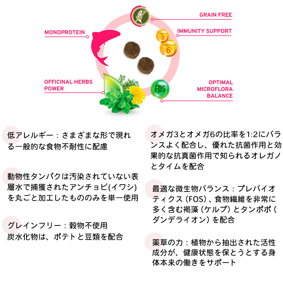 ミニ / ミディアム:カタクチイワシ、じゃがいも、じゃがいも澱粉、じゃがいもプロテイン、魚油(ミックストコフェロールで保存)、精製鶏脂、全エンドウ豆、加水分解された動物性蛋白質、乾燥ケルプ、フラクトオリゴ糖、ユッカシジゲラ、ビタミンA、塩化コリン、タウリン、DL-メチオニン、ビタミンE、ダンデライオン、硫酸亜鉛一水和物、オレガノ、タイム、銅アミノ酸キレート、ナイアシン、ローズマリーエキス、D-パントテン酸カルシウム、リボフラビン、ピリドキシン塩酸塩、チアミン塩酸塩、葉酸、ビタミンB12