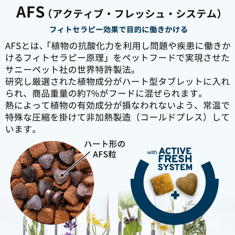 この植物成分が入ったハート型タブレットはAFS(アクティブ・フレッシュ・システム)という特許技術です。常温のまま圧縮するコールドプレス製法だから植物の有用成分がそのまま維持されています。また粒表面を魚油でコーティングして嗜好性を高めています。