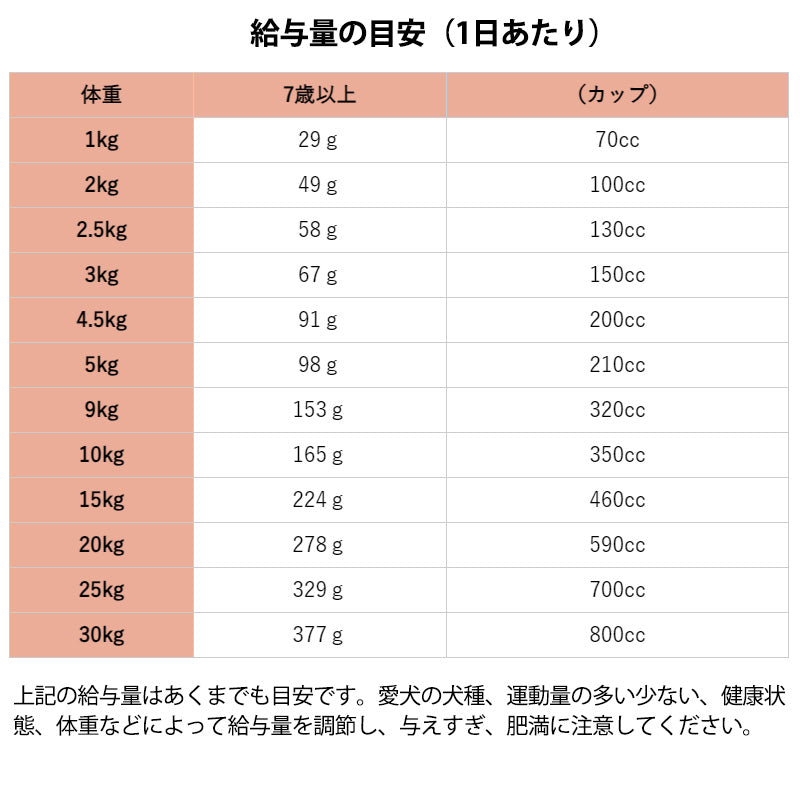 ・給与量(画像を参照ください)はあくまでも目安です。愛犬の犬種、運動量の多い少ない、健康状態、体重などによって給与量を調節し、与えすぎ、肥満に注意してください。