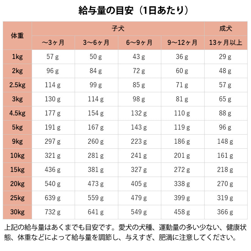 ・給与量(画像を参照ください)はあくまでも目安です。愛犬の犬種、運動量の多い少ない、健康状態、体重などによって給与量を調節し、与えすぎ、肥満に注意してください。
