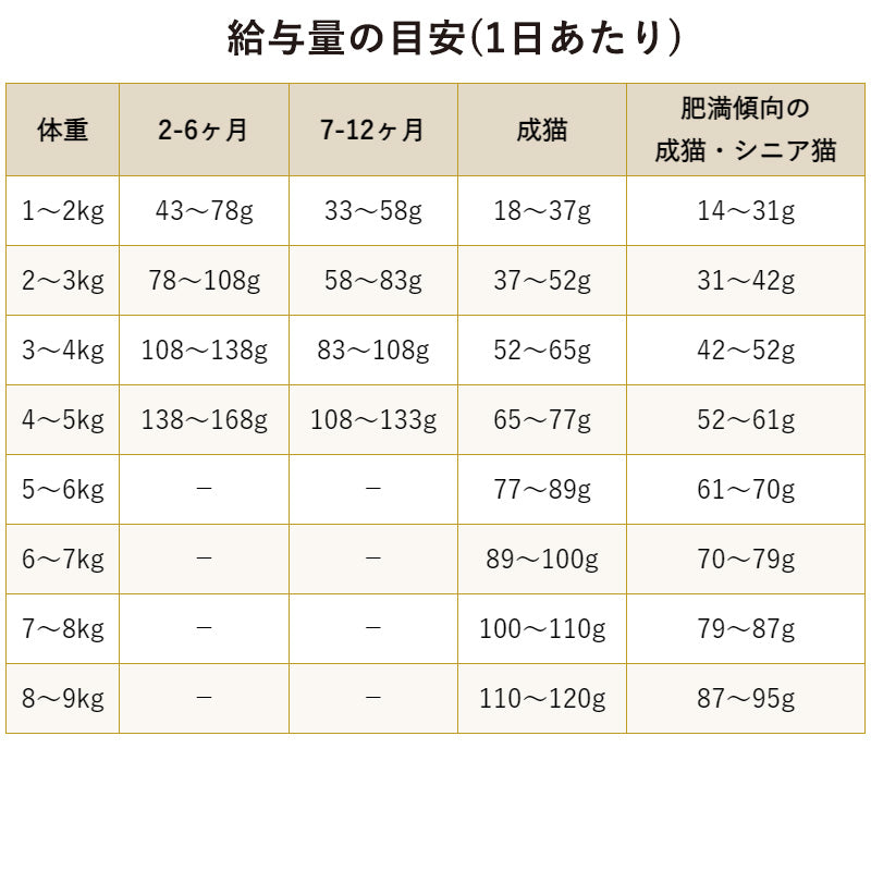 粗タンパク質 43.0%以上/ 粗脂肪 20.0%以上/ 粗繊維 3.5%以下/ 粗灰分 9.5%以下/ 水分 10.0%以下/ オメガ6脂肪酸 3.5%以上/ オメガ3脂肪酸 1.25%以上/ グルコサミン 300mg/kg以上/ コンドロイチン 100mg/kg以上/ カルシウム 2.5%/ リン 1.5%/ ナトリウム 0.31%/ マグネシウム 0.13%/ タウリン 0.3%以上