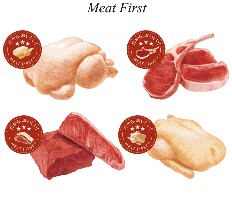 愛犬の体に必要なアミノ酸をバランスよく含むチキン・ビーフ・ラム・ダックなどの肉を第一主原料に使用し、おいしさをそのまま封じ込めました。